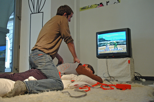 A wearable massage interface that turns a video game player’s excess energy into a back massage for an innocent bystander